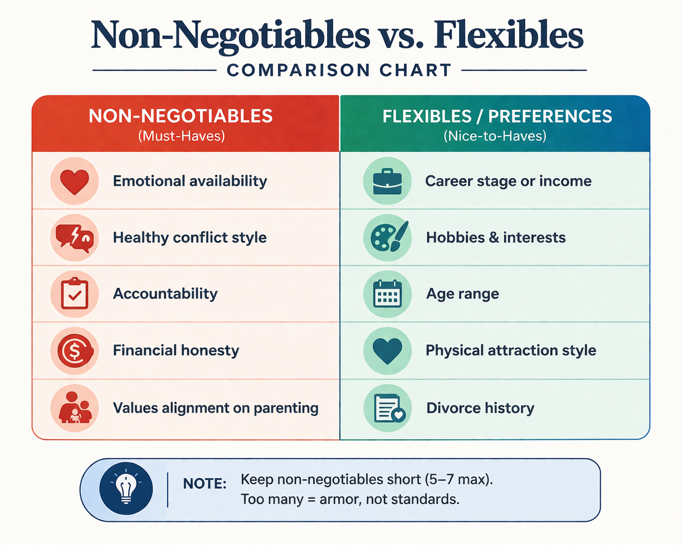 Preferences (flexibles) include career stage, income level (within reason), hobbies, or age range. These matter, but they shouldn’t be absolute deal-breakers.
